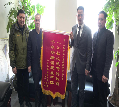 1月22日,平江縣梅仙鎮(zhèn)玳璋村幫扶對象,將一面寫著"一片初心扶貧傳佳話,千秋功績留愛在平江"18個大字的鮮紅錦旗送到市水建投董事長劉寶山、總經(jīng)理楊雄輝的手中,對市水建投對精準(zhǔn)扶貧工作的大力支持表達(dá)誠摯謝意。